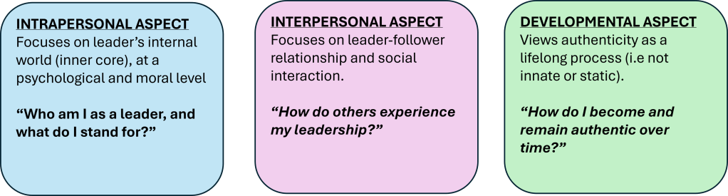 - Authentic leadership operates across 3 interconnected dimensions (as below) and when viewed together, it describes how authenticity is formed, expressed and sustained by leaders.