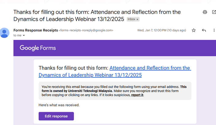 (Note: After attending the talk via recording, I accordingly completed the feedback form and received this email on my completed form. I was looking forward to also receiving the certificate of attendance but noted that it has still not been sent to my email. As a reference of my attendance, below are screenshots of my completed Google Form):