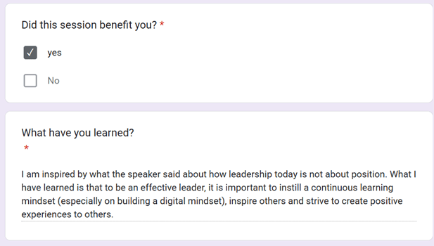 I was able to attend the expert talk via watching the recording, and while not able to attend it live, I was still inspired by what the expert speaker had to share, particularly on the leadership principles as well as on instilling a continuous learning and adaptive mindset.